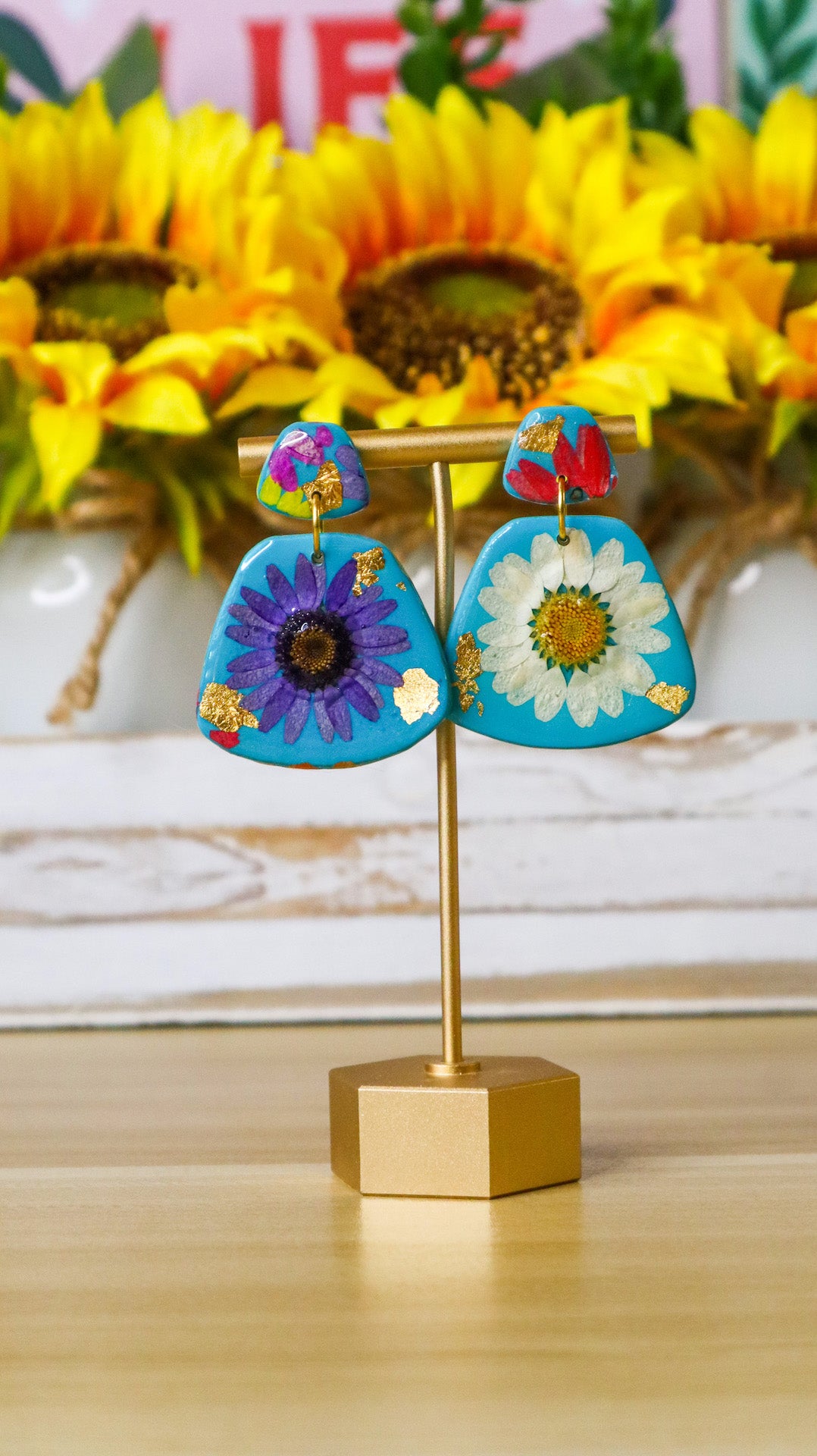 Robin Egg Blue Earrings with real pressed flowers and gold flakes. Handmade using high quality polymer clay.
