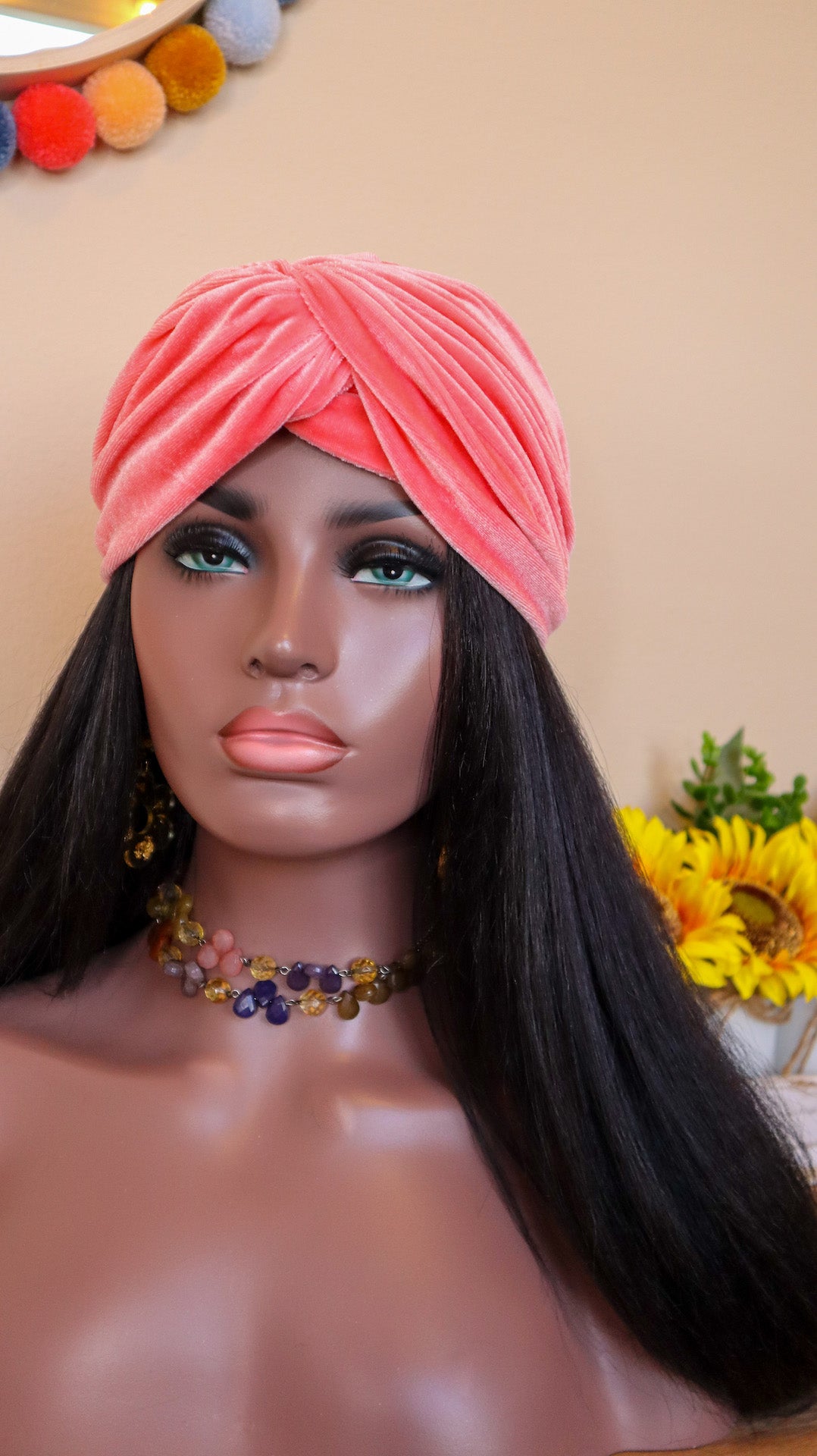 Handcrafted made to order coral stretch velvet turban.