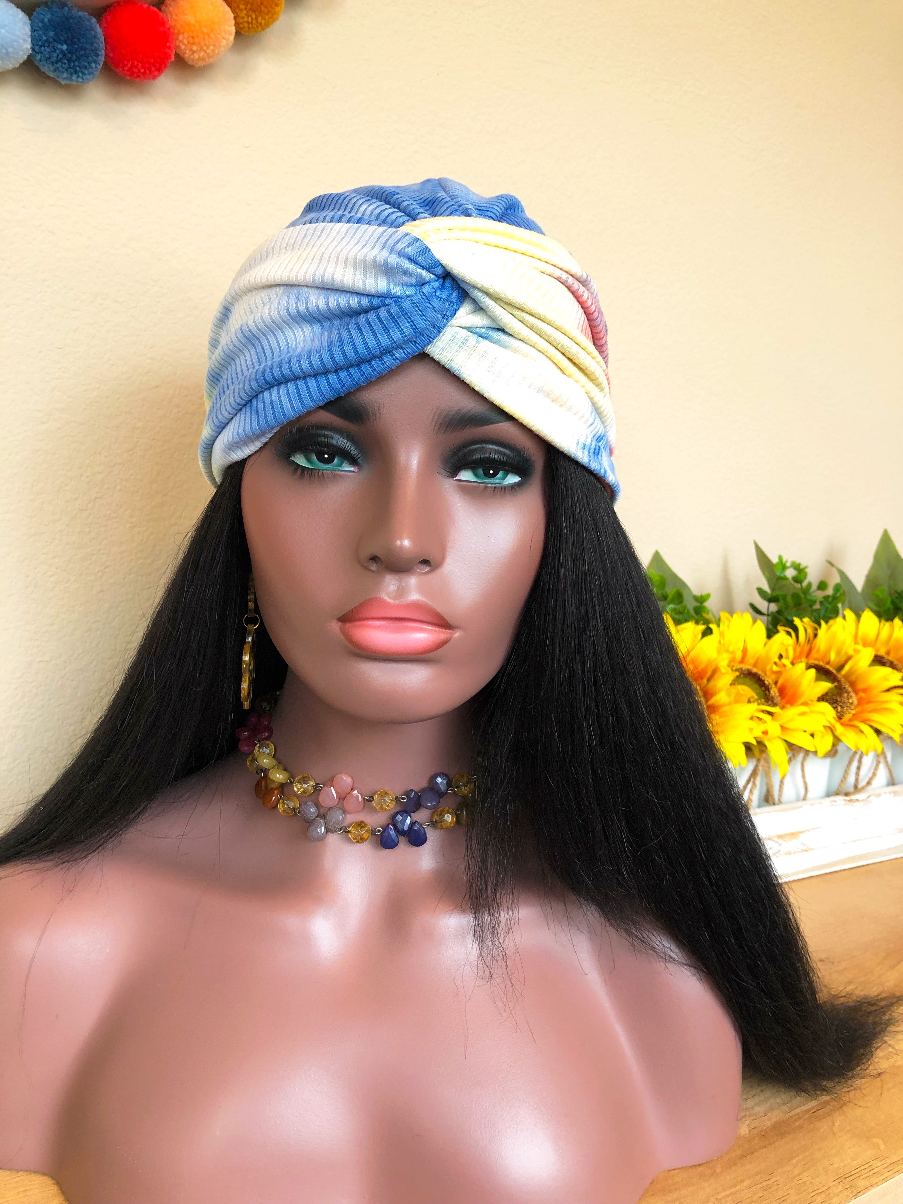 Made to order soft ribbed knit stretch turban. Features a mixture of blue, pink, and yellow.