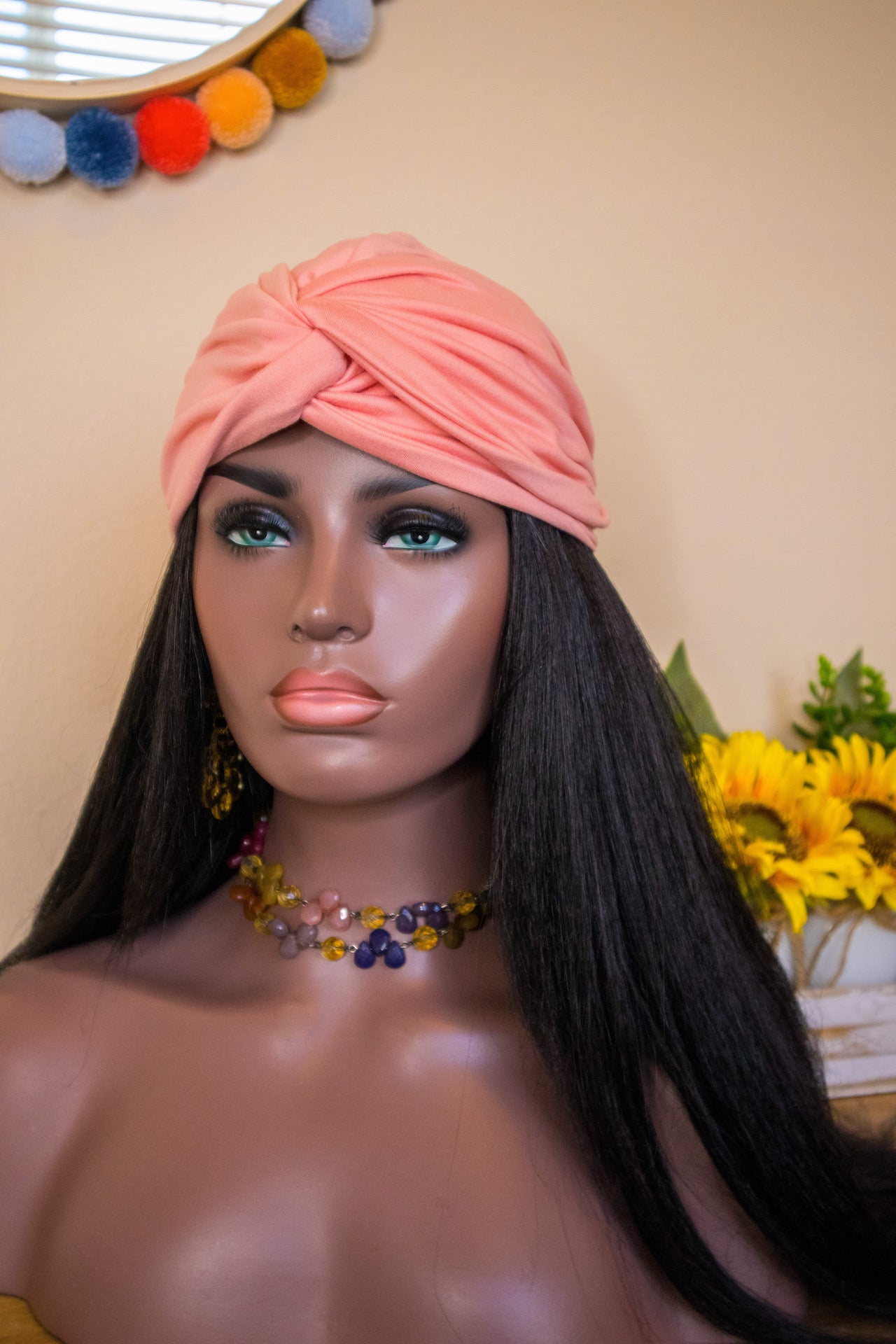 Handcrafted & Made To Order Soft Pink Twist Head Tie Turban Headwrap by Adorned By Cherice. This soft and comfortable head wrap is made with stretch double brushed knit fabric. It is also easy to tie.